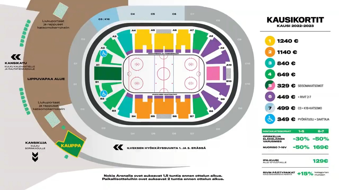 Tälle kaudelle ainakin myytiin kausareita C-sivulle katsomoihin C4-C6. Tuon lisäksi C3-anniskelukatsomoon sai ostettua kausareita. dr Origon viestistä löytyy kuva ja hinnat viime kesältä.