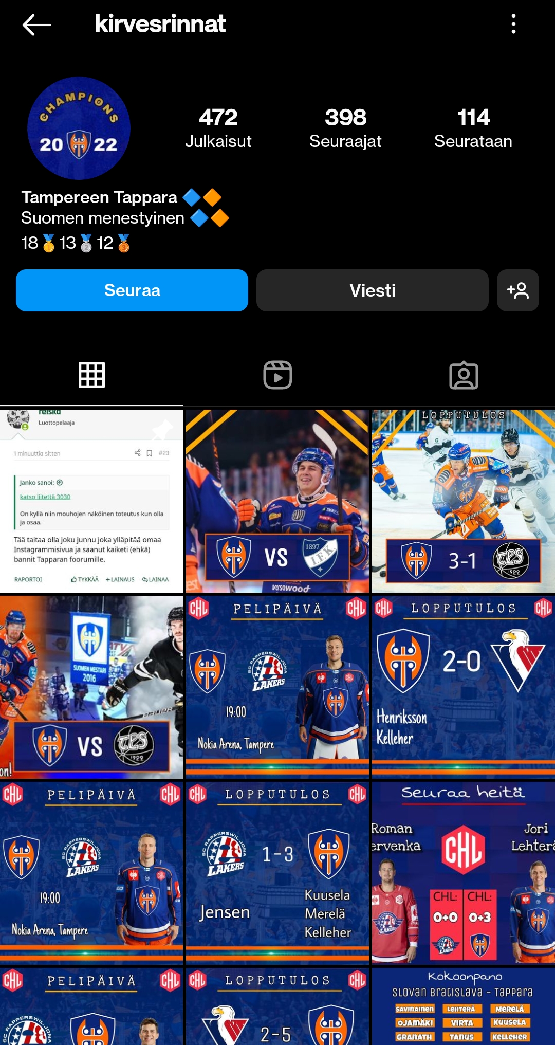 Sen verran korjaan, että ei pidä tuota IGstä löytyvää @Kirvesrinnat tiliä yllä, vaikka täällä sillä nimimerkillä kulkeekin.Tää taitaa olla joku junnu joka ylläpitää omaa Instagrammisivua ja saanut kaiketi (ehkä) bannit Tapparan foorumille.