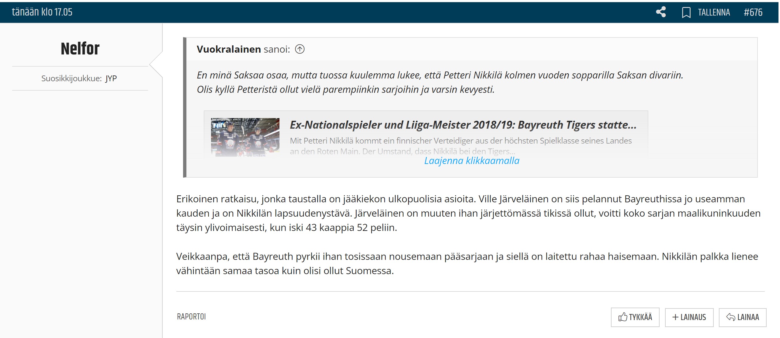 No ei ainakaan alkuperäinen suunnitelma ollut, kun KooKoo-sopimuksen yhteydessä Nikkilä kovasti puhui vetävänsä yhden kauden Liigaa ja sitten pomppaavansa kovempiin sarjoihin. Niin harhainen ei voi olla, että luulee sarjan jossa Ville Järveläinen tekee 43 maalia olevan kovempi sarja kuin Liiga.