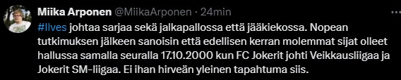Nyt oli sellainen Ilves päivä että en hetkeen muista.. Kysymys tietäjille onko mitään joukkue ollut ykkösenä koskaan samaan aikaan jääkiekko ja jalkapallo?