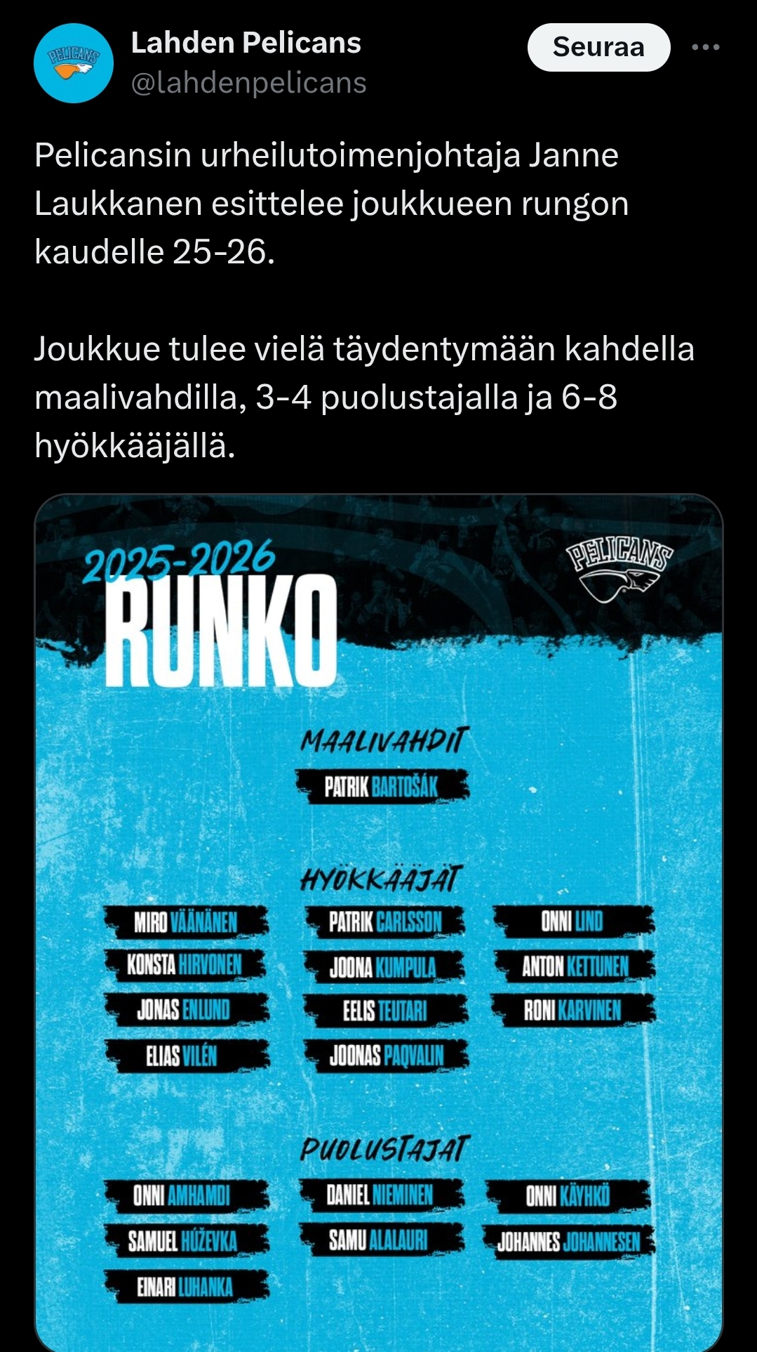 "Patrik Bartosak tuo väriä Pelicansiin tulevaisuudessakin". Näistä pelaajien rikoshistorioista kun on keskusteltu, on toki hyvä, että naisten- ja läheistenhakkaajat ja rattijuopot kumminkin löytää töitä täältä meidän liigasta.