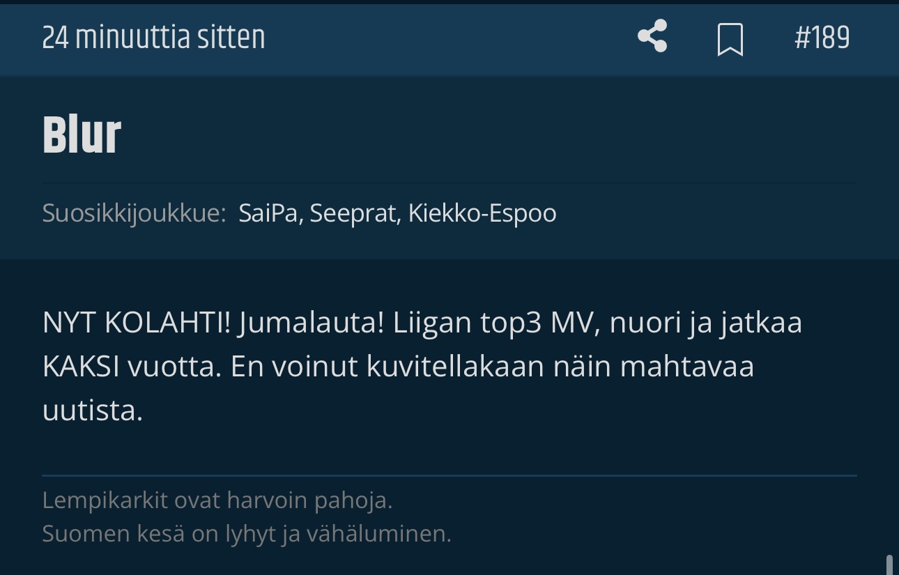 "Ei nyt varsinainen siirtohuhu, mutta SaiPa julkaisee huomenna aamulla kymmeneltä jatkosopimuksen instagram-videon perusteella. Videossa jonkinlainen pelilauta, jossa nostettuna 2 ja 6, sekä heitetään nopilla 5 + 5, noppien kaikkien näkyvien sivujen silmälukujen summa 23. Voisi olla ensi kauden sopimus joko Kivenmäelle (#10) tai V.Petmanille (#23)."