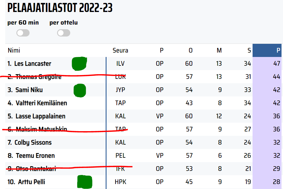 Tuossa alla vielä viime kauden puolustajien pistepörssi. Pelli oli kymmenes ja teki melkein 20 pistettä vähemmän.