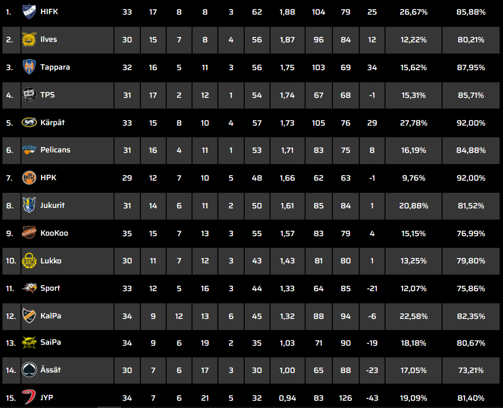 Hpk on noussut sarjassa jo kahdeksanneksi, eivätkä ole Ilveksestäkään kuin yhdeksän pinnaa jäljessä. Heillä onnistui valmentajan vaihtaminen ihan nappiin. Saa nähdä onko Ässät jo myöhässä omansa kanssa. Ässien materiaali ei ole sarjan huonoin.