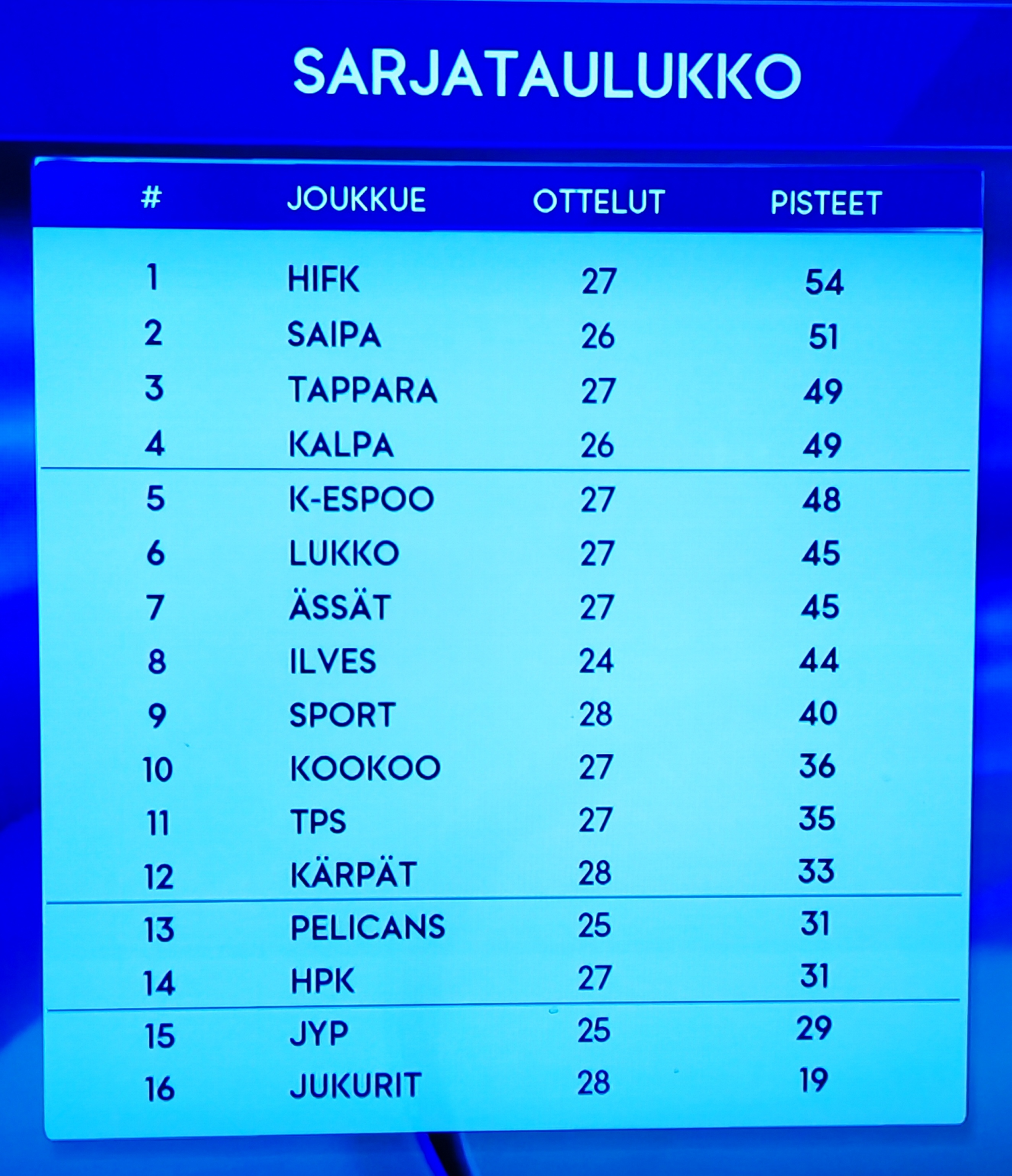 Toki toisaalta jos aattelee asiaa laajemmin, niin eipä kovin moni olisi veikkaillut SaiPaa taas sinne sarjan ylärekisteriin. Että periaatteessa SaiPan pitäisi olla Kärppien alla ja Pelicansin (jopa) yläpuolella, tai ainakin kamppailemassa Kärppien kanssa paremmista/hyvistä sijoista.