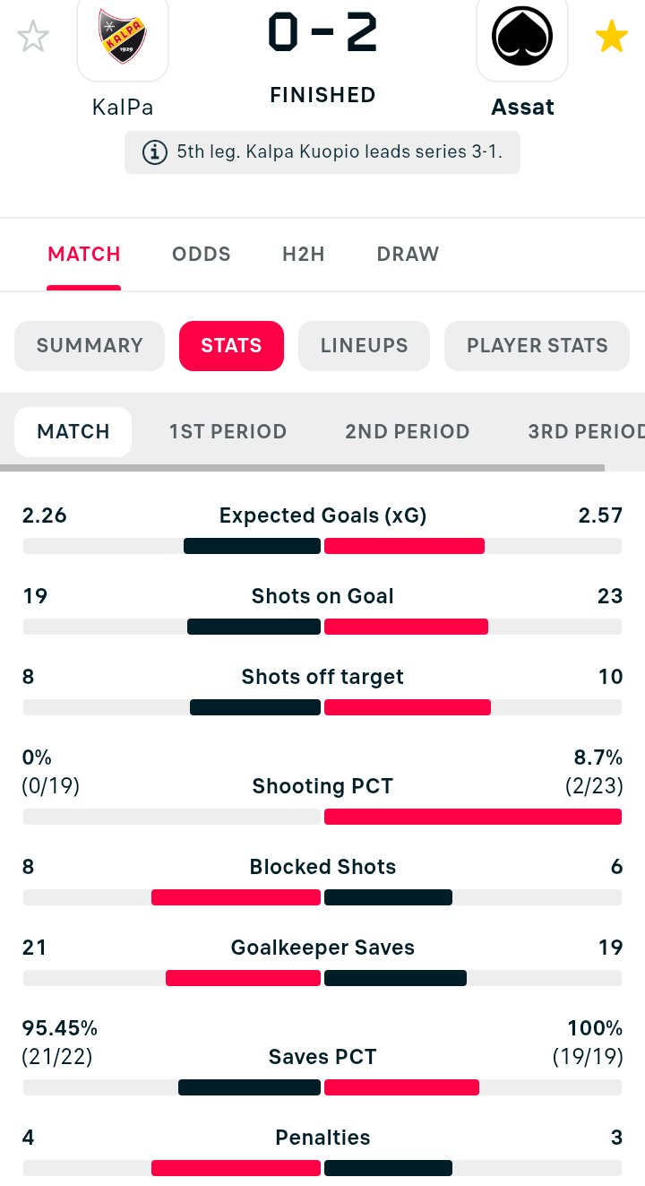 En peliä kattonut, mutta alkuun sai ainakin täältä seuraten ettei kovin erikoinen esitys ollut ässillä menossa. Nuo tilastot yllätti.Mitä meinasit? Tasainen peli, vähän kun Ipa-Tape tilastot parista pelistä.