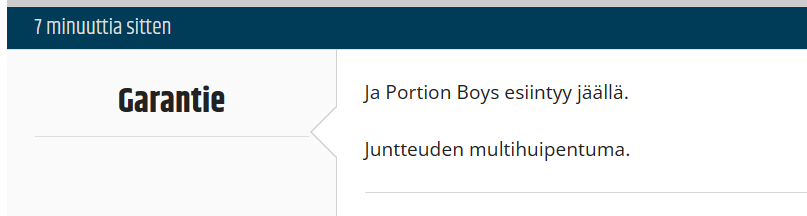 Ihme ku Portion Boys ei laulanu traktorin päällä ja huutanu helou mouhijärvi.Täytyi lähteä katsomosta karkuun tuota erätaukoesitystä, onneksi asiasta varoitettiin kuulutuksella. Miksi väkisin pitää luoda tällaista imagoa...