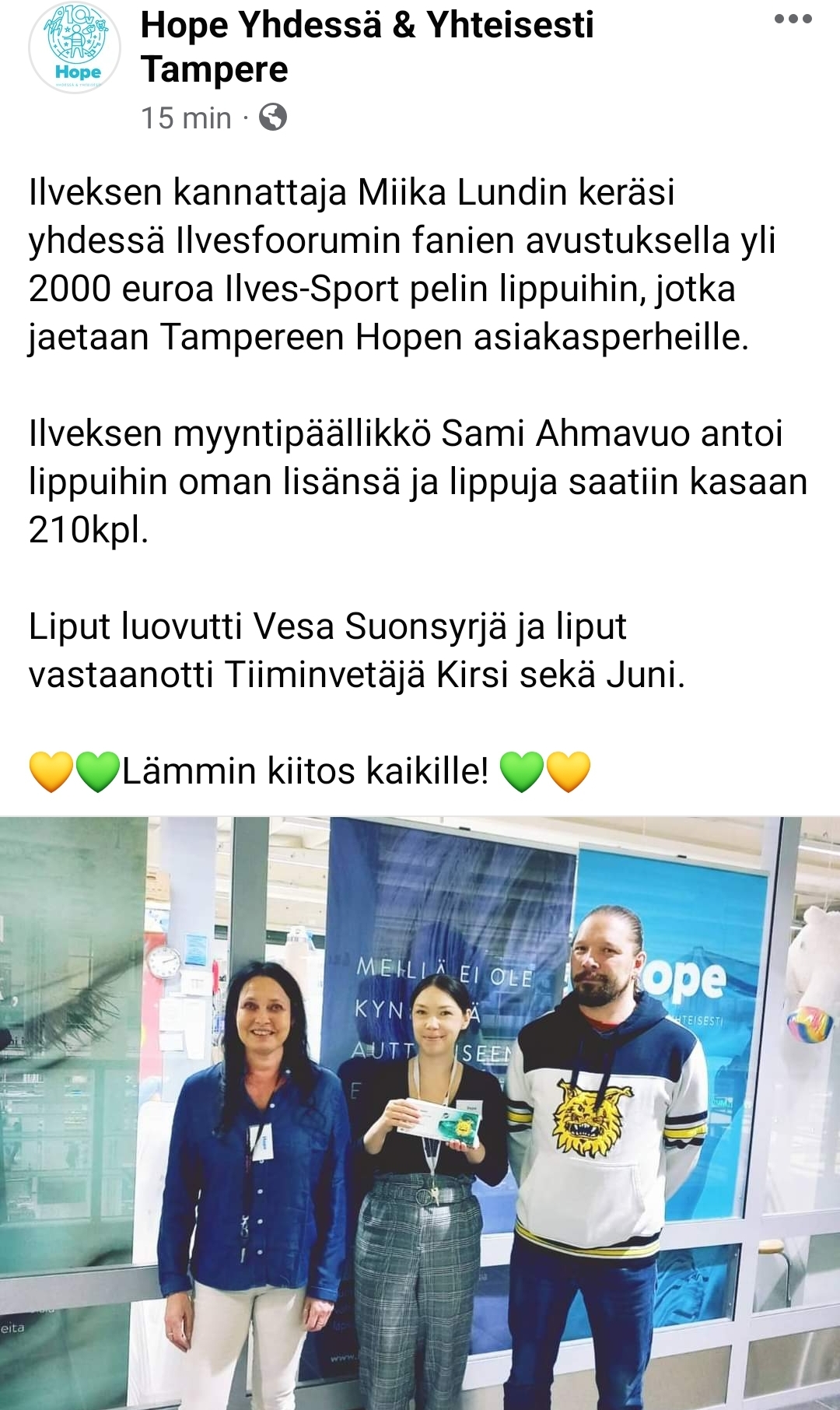 Mä en osaa naapurin touhuista sanoa mitään, mutta kun olin alunperin @Miika Lundin :lle ehdottamassa, että käynnistetään tämmönen juttu ja jos riittävän pitkälle tätä ketjua selaa, niin sanon siellä jokseenkin näin, että jos saatais tällä hyvää mieltä sellaisille vähävaraisille, joilla ei muuten ole mahdollisuutta käydä peleissä ja jos samalla jäisi joku ropo Ilvekselle. Ja näistä molemmista hyvä mieli itsellekin.Tää on hieno kamppis, mutta ihan samaa settiä naapurin "ilmaisia lippuja koululaisille"- jutun kanssa.