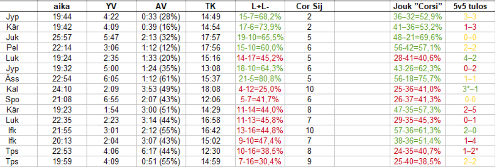 Jasekin henkilökohtaiset peliajat ja laukaisutasapaino, joka on nyt kahdeksan ottelua putkeen pakkasella. Viimeisessä kahdeksassa pelissä ollut vain kerran sijoituksellisesti hyökkääjien paremmassa puolikkaassa. Tuo "joukkuecorsi" ei ihan täysin vertailukelpoinen ole yksilöcorsiin, koska joukkueversiossani olen riisunut pois esimerkiksi ilman maalivahtia tulleet vedot, 4v4 kudit ja kaiken maailman muut erikoisuudet, mutta antaa tuo kuitenkin jotenkin suuntaa kollektiivin kokonaisuudesta.