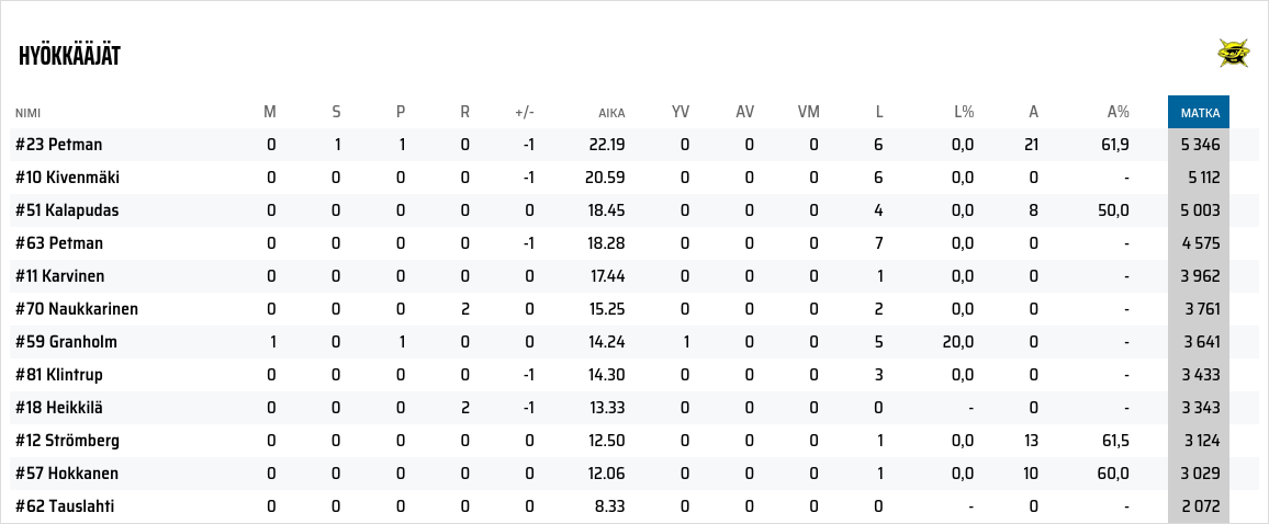 Koko ykkösvitja yli viisi kilometriä, Ilveksestä ei kukaan. No, Lööke 4900. Mutta tuo ykkösvitja jaksaa painaa. Sihvonenkin taisi jo viime kaudella Jukureista puhuttaessa kehua Jokista siitä, että on tuonut luistelua takaisin suomalaiseen kiekkoon joka viime vuosin on tottunut tähän passiivisempaan menemiseen. Jostain syystä unohtunut tämä että hyvä luistelu mahdollistaa aika hemmetin monta asiaa tuolla kentällä.