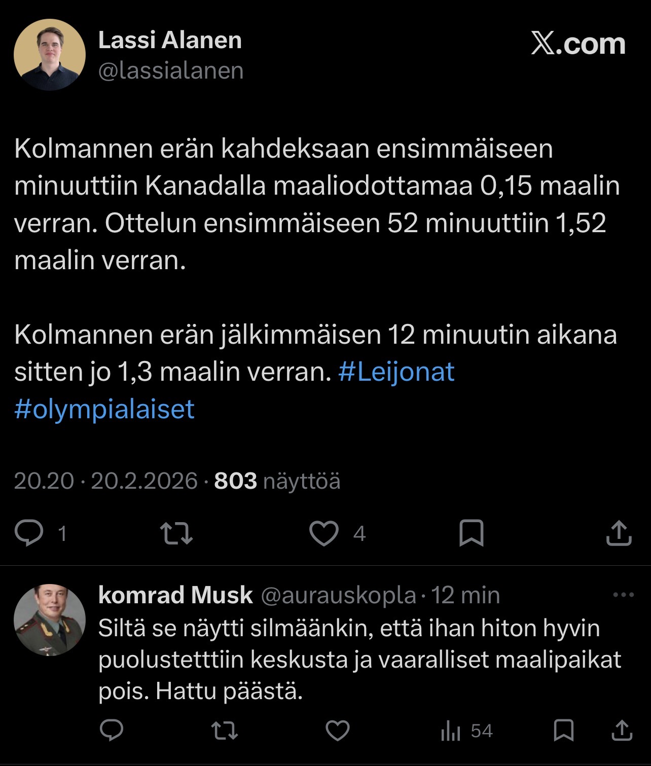 Lopeta nyt hyvä mies. Suomella oli paikat voittaa ottelu kolmannessa.Valmentajina on tällaisia Raipeja ja Summasia jotka osaa reagoida kun näkee että peli karkaa käsistä ja huutaa ja vaikka hakkaa pari mailaa paskaksi että saisi sen tunnetilan selviytymismoodista taistelumoodiin.