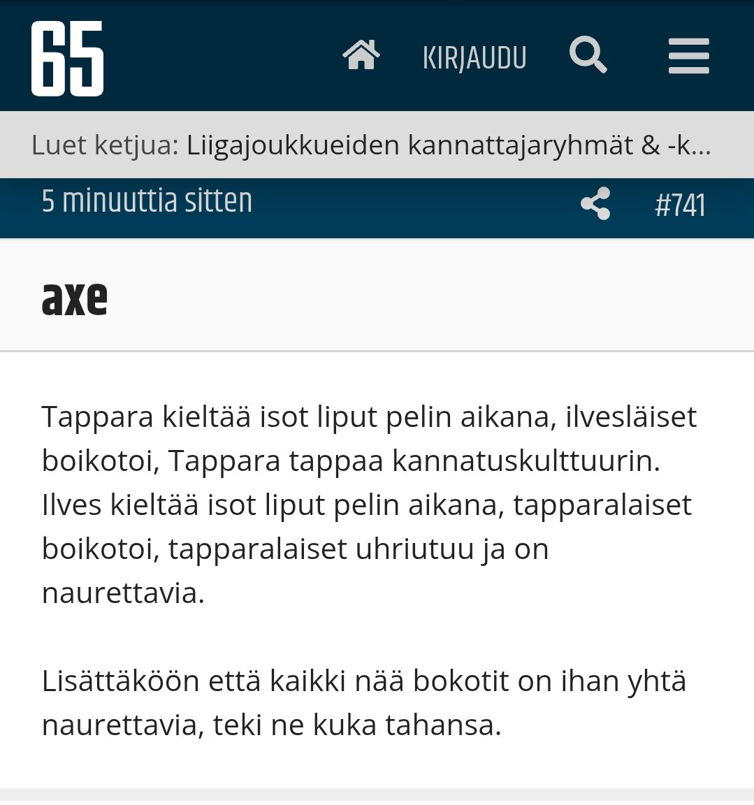 Nolointa tuossa kaverissa näissä tämän aihepiirin kommentoinnissa on se, että hän on entinen Tapparan toimiston työntekijä. Vähän sama kuin jos joku Lasse Fihl lähtisi Ilveksestä muihin hommiin ja meuhkaisi somessa kaikkea Ilves-Tappara -asetelmaan liittyvääHelvetti tääkin apina on raskas yksilö. Joku voisi käydä oikaisemassa että mouhot kielsi alunperin nimenomaan kaikki liput ja että se Osaston boikotti nyt koskee vähän muutakin kuin lippuja.![]()