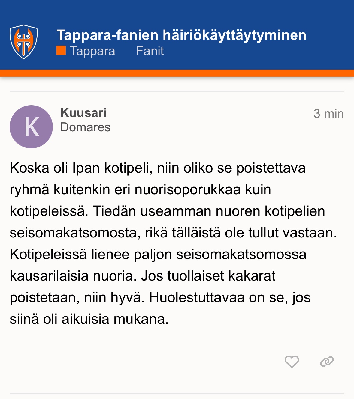 Täällä hiillostettiin paljon enemmän Osastoa asiasta, mihin he ilmeisesti loppujen lopuksi liittyivät jokseenkin vähän, kuin mitä naapurin foorumilla (jonka suhtautuminen ultriin on muutenkin paljon nuivempaa mitä täällä) onsseja asiasta minkä koko Suomi näki onssien tehneenMiksi ei tapparan foorumilla ole samanlaista noin 500 viestin ketjua eilisestä, kun oli silloin pari kuukautta sitten siitä junnujen pelistä?.. luulis että siellä tuohon omien perseilyyn puututtais samallatavalla..