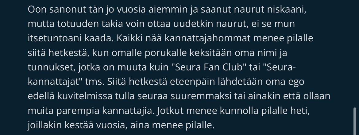 Itsekin sitä mieltä että kannattamiselle pitäisi aina antaa täydet mahdollisuudet mutta tällä kertaa kyllä kieltämättä naureskelin koska kohteena oli juuri mouhot jotka ovat sitä kannattamista jo kauan ennen areenaa yrittäneet hiekoittaa käytännössä kaikilla mahdollisilla keinoilla joten ihan hyvä että kerrankin Ilves antaa vähän takaisin.