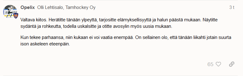 Eikös ilmaislippuja jaeta vain kauden viimeiseen eli Ässät peliin?Jotenkin jäi tuosta viimeisen kympin hyppimisestä olo, että kun ei meininkiä saatu ilmaislipuilla muuten halliin niin yritettiin vaikka hyppiä, koska oli nähty isojen poikien tekevän niin joskus. Ja tappion jälkeen koko "fani"pääty tyhjäksi silmänräpäyksessä. Tästä tuskin kukaan yllättyi.