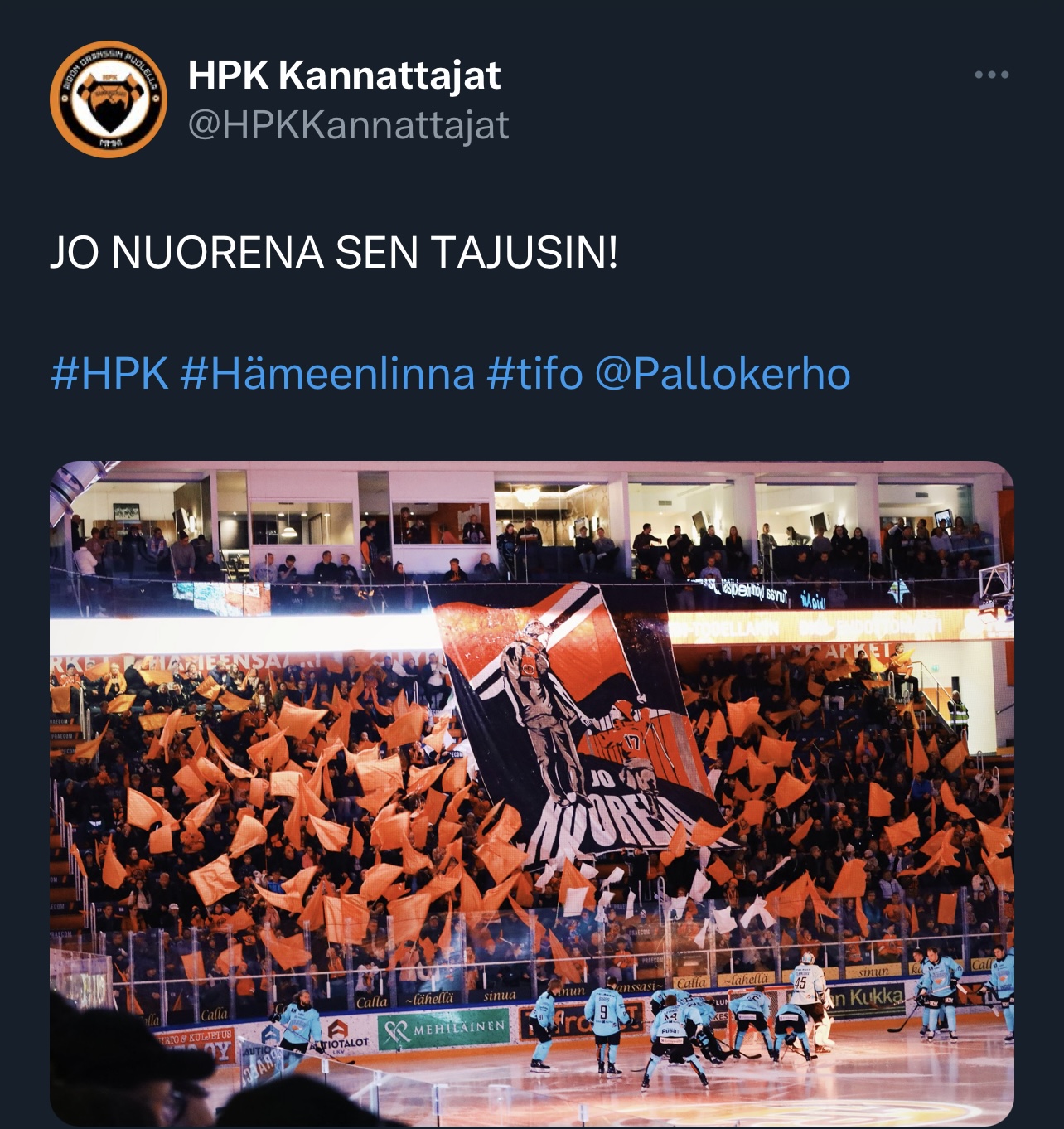 Heh, onko nämäkin kopioitu. Kuuntele minkä vain joukkueen chantteja niin samat melodiat pyörii, mitä jos Osasto onkin kopioinut nämä Sinioransseilta, iso osa on kumminkin varmaan 5-10v vanhoja chantteja.Katselen tässä ensimmäistä kertaa Tapparan kotipeliä.