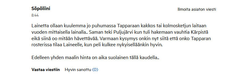 Laine tienaa 8,7 miljoonaa dollaria kaudesta. Luulen kyllä Keklun suostuvan tähän, jos Tappura avaa vähän niitä lompakon nyörejä. Olisiko joku maksatte 50% diili esim?Tämän voinee ottaa huumorilla, suoraan todella luotettavasta Aamulehden Lainetta koskevan jutun kommenttiosiosta: katso liitettä 6367
