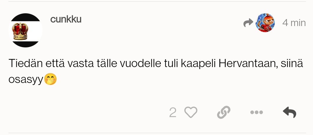 Useammassa ketjussa mm. eilen illalla. Ei siellä toki ole kuin muutama vakionimimerkki, joilla tuntuu olevan intoa enemmän kuin järkeä ja jutut ovat sitten sitä luokkaa, että puoliksi haukotuttaa, puoliksi hävettää. Vittuilunkin voi hoitaa tyylikkäästi/nokkelasti, mutta kun muutaman innokkaan Ilves-tulittajan "sivallukset" ovat kuin suoraan ala-asteen välitunnilta.