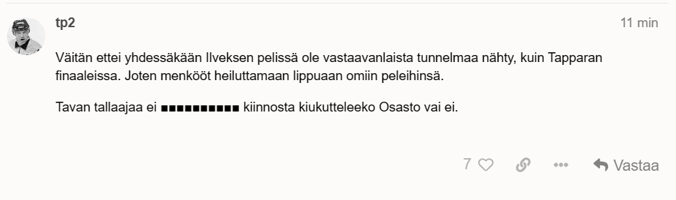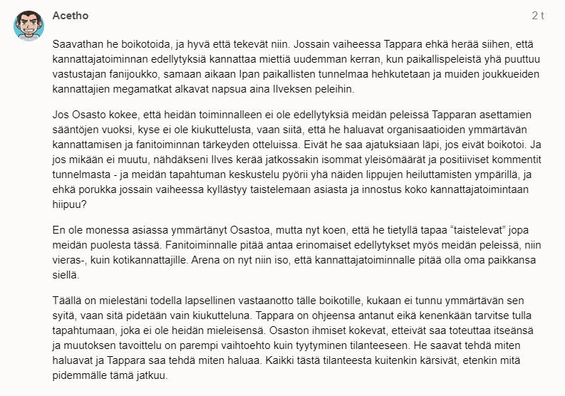 Näin jälkikäteenkin luettuna ihan mielenkiintoinen keskustelu. Tokihan sinnekin eksyi väliin näitä "lippujen ei kuulu heilua pelin aikana" -mielipiteitä, mutta enemmän näytti saavan myönteistä palautetta Tapparan kannattajiltakin.