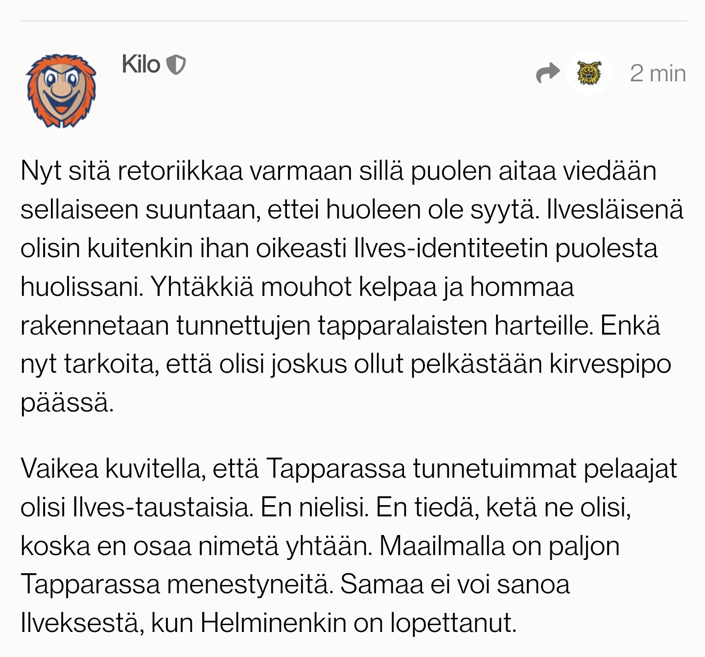 "Sitten tähän kauheeseen Ilveksen ottelutapahtumahehkutukseen. Olen käynyt nyt katsomassa Ilveksen eilisen pelin ja Ilves-Kärpät game sevenin kokeakseni millainen tämä paljon hehkutettu “parempi ottelutapahtuma” on. Tapparalta olen käynyt kaikki tämän kevään playoff-pelit tähän asti. Vaikka kuinka objektiivisesti asiaa pyörittelen ja olen asiaa tarkastellut, niin en kyllä ymmärrä hehkutusta Ilveksen ottelutapahtumasta ja tunnelmasta. Toki Ilveksellä on tällä hetkellä paljon yleisöä ja siitä täytyy näin tapparalaisena olla kateellinen, mutta mielestäni kaikki muu hehkutus on täyttä värikynää.