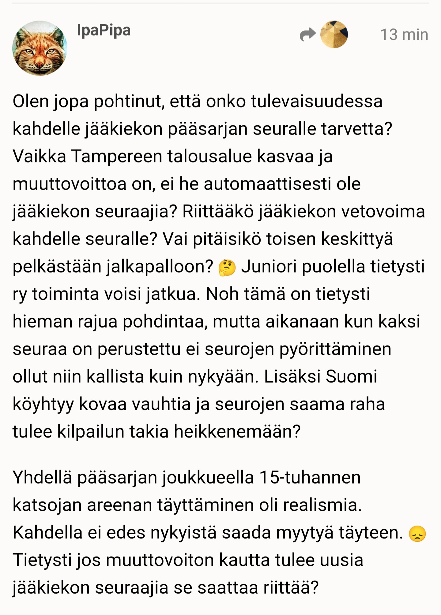 Emminä nyt tiedä katsooko naapuristakaan kukaan tuollaista avausta "tolkun kannattajana" koska onhan tuo piikki myös Tapparan suuntaan.