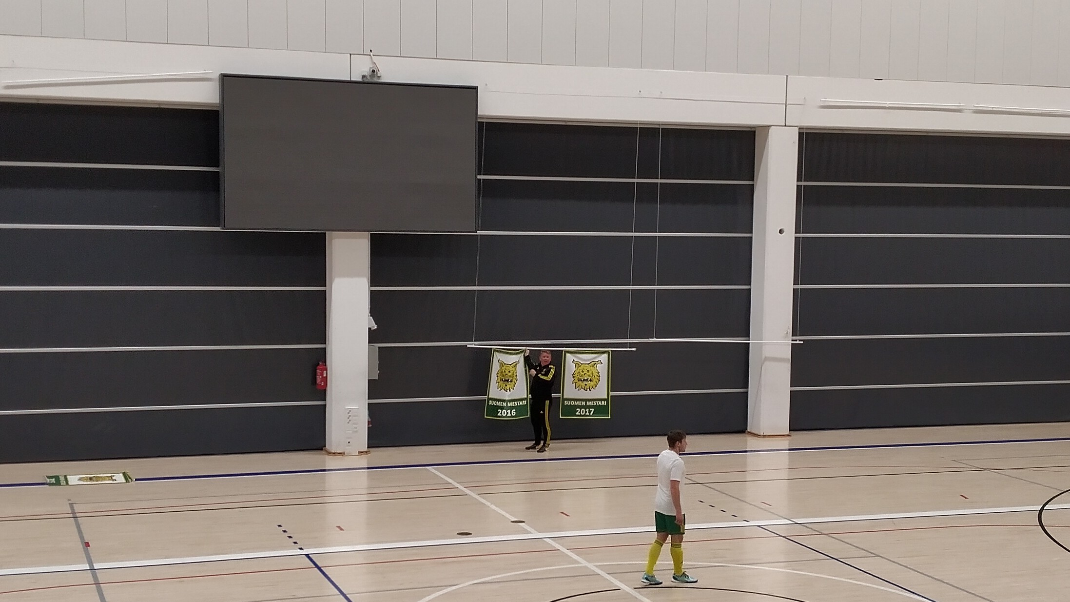 Ikuisuusaihe mestaruusviireihin vähän perspektiiviä Kauppi Sports Centeristä. Naisten Futsal-liigassa mestaruusviirit laitetaan jokaiseen peliin erikseen ja poistetaan heti pelin jälkeen. Nokia Arenassa ei ole onnistunut vielä tuokaan.