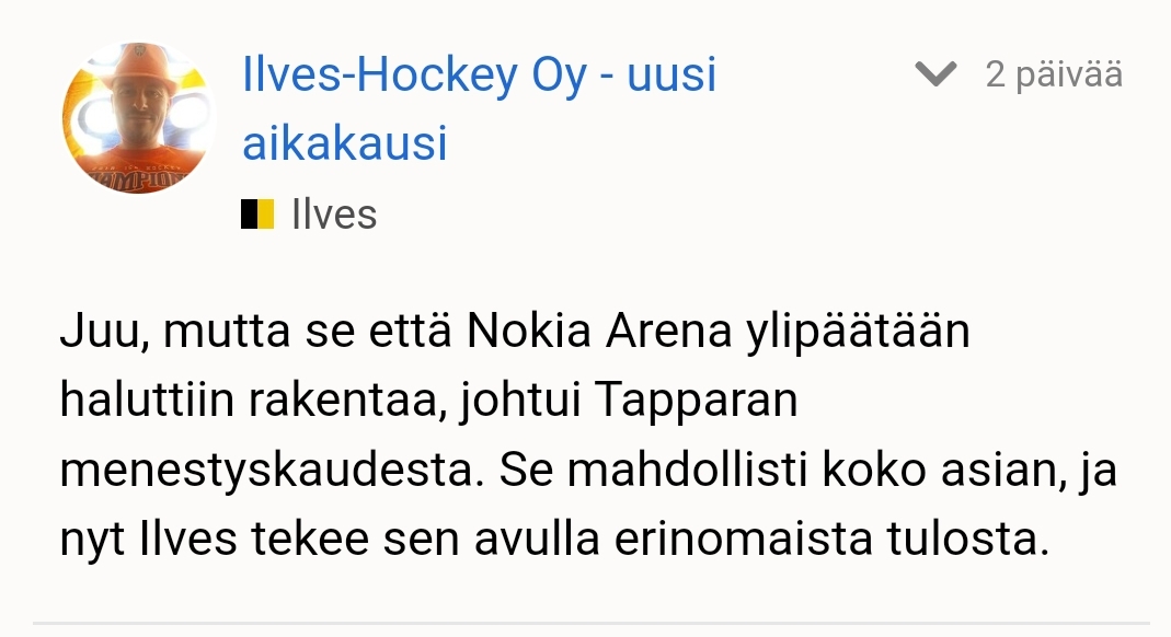 No suunnittelu aloitettiin 2010, jolloin Tappara teki ihan yhtälailla tappiota ja urheilullinen menestyskään ei ollut hyvää. Eli Areenaa ei kyllä todellakaan alettu suunnittelemaan minkään Tapparan menestyskauden takia.Siinä mielessä oikein, että jos Tappara taloustilanne olisi ollut suunnitteluvaiheessa sama mikä Ilveksellä silloin oli, hallisuunnitelmaa ei olisi todennäköisesti edes lähetty viemään eteenpäin. Ilveksen talousasioihin sillä ei ollut tosin mitään vaikutusta, hommathan saatiin kuntoon jo ennen ensimmäistä ottelua hallissa. Kyllä seura ihan itse ne korjasi ilman hallia, sen taloudelliset vaikutukset ovat tulleet voimaan vasta viimeisimmän vuoden aikana. Hyvän talousboostin halli kuitenkin antaa kummallekin joukkueelle tällä hetkellä. Näitä suljetulle osastolle kuuluvia kirjoittelijoita löytyy kyllä joka joukkueen puolelta, eipä noilla kannata palstatilaa antaa.