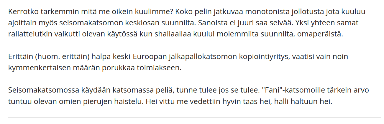 Kirjoittaja vastaa myös niille, joiden mielestä laulaminen ja chänttääminen eivät sovi katsomoon vaan pitäisi reagoida peliin, että eiväthän nämä sulje pois toisiaan. Hän piti "tunne tulee jos se tulee" ja joukkueen tulee ansaita kannustus -ajattelua laiskana kannattamisena ja surullisena sitä, että kun puolivälieräkotipelissä olivat yhden maalin tappiolla, niin jäivät myös katsomossa saman tien aivan jalkoihin.