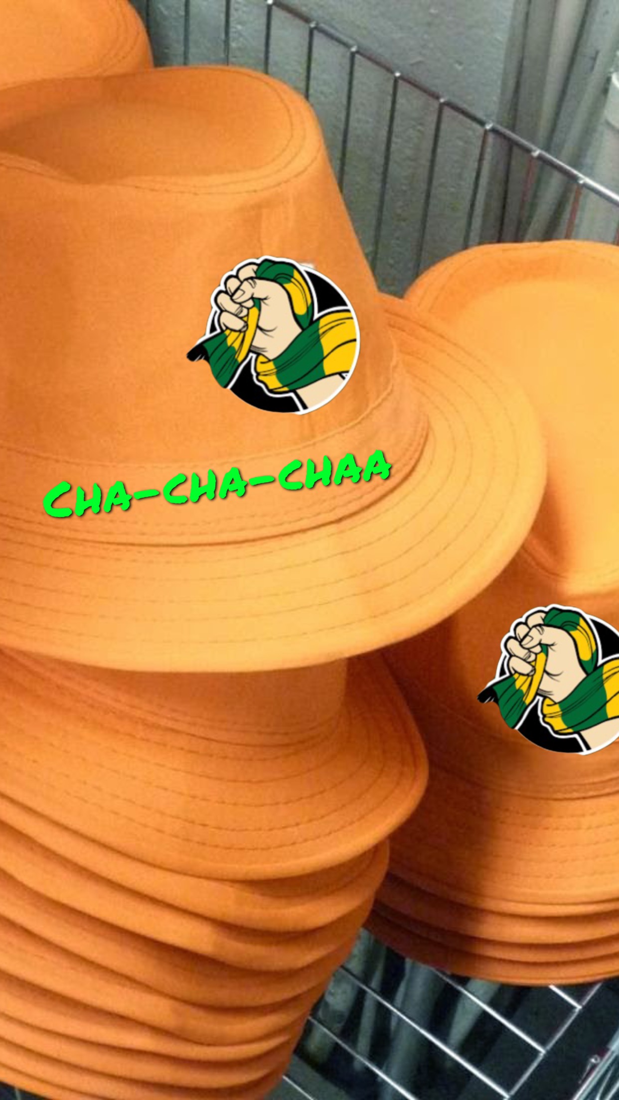 Sellanen jossa Osaston logo ja joku Käärijän cha cha chänttiSaiskos sellasen oranssin hatun?