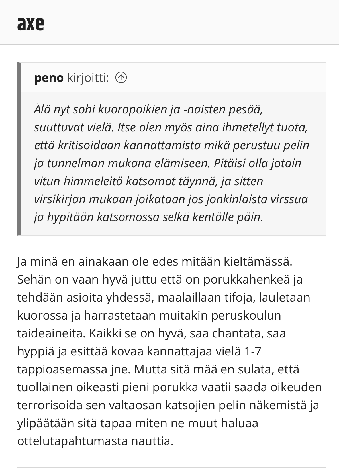 Muutaman vilpittömän kysymyksen myös haluaisin esittää, kun tämä asia jäi Aamulehden kuvan jälkeen pohdituttamaan ja tästä kannattajaskenestä en ole perillä (asia toki kiinnostaa).Jätkät kannattavat Hakaa jalkapallossa ja Ilvestä lätkässä. Ei siinä mitään sen kummempaa ole. Haluavat kuitenkin kantaa oman Ultras-porukkansa värejä, ja se on skenessä ihan yleistä. Sinänsä olet oikeassa, ettei Osaston sektioon ihan minkä tahansa jengin tunnuksilla pääse, mutta tällä tietyllä mobilla on siihen ansaitut erityisoikeudet.