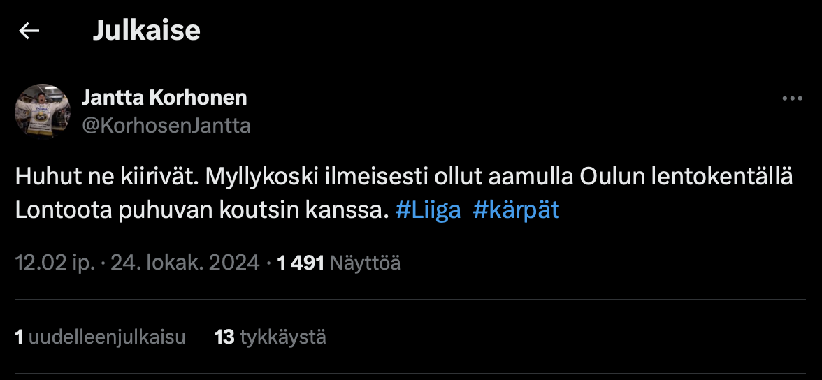 Kärppien jatkoajassa samaa tietoaOliko tuohon aamujäiden peruuntumiseen mitään muuta konkreettista tietoa kuin yksi tappara.colta linkattu viesti? Itselle ei ainakaan muuta osunut silmään