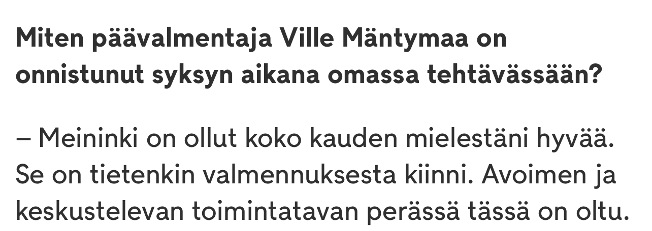 Mäntymaa toi toivottua rentoutta kun Marjamäki sai potkut.Mäntymaa vaikuttaa kommenteissaankin tyyliin siltä, että ei paljon jaksa taktiikoita miettiä tai esimerkiksi videoita katsella. Voihan se olla vaan luontaisesti hönö ja pökkelö olemus, mutta eipä toisaalta tuloksetkaan vakuuta.