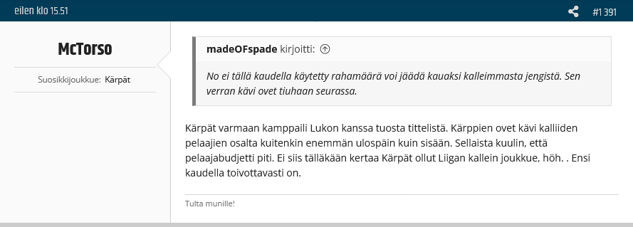 Kärppien menneestä kaudesta. Syyllisiä oli ensin käytännössä lähes koko pakisto, joista kesken kauden saivat lähteä: