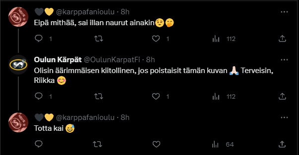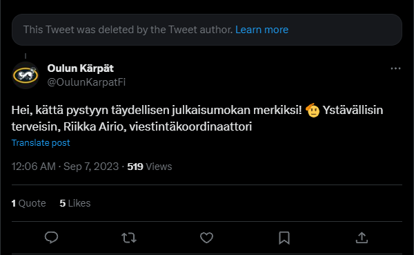 Tällainen vastaus oli Kärppien tililtä annettu.