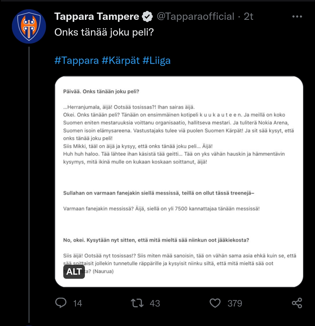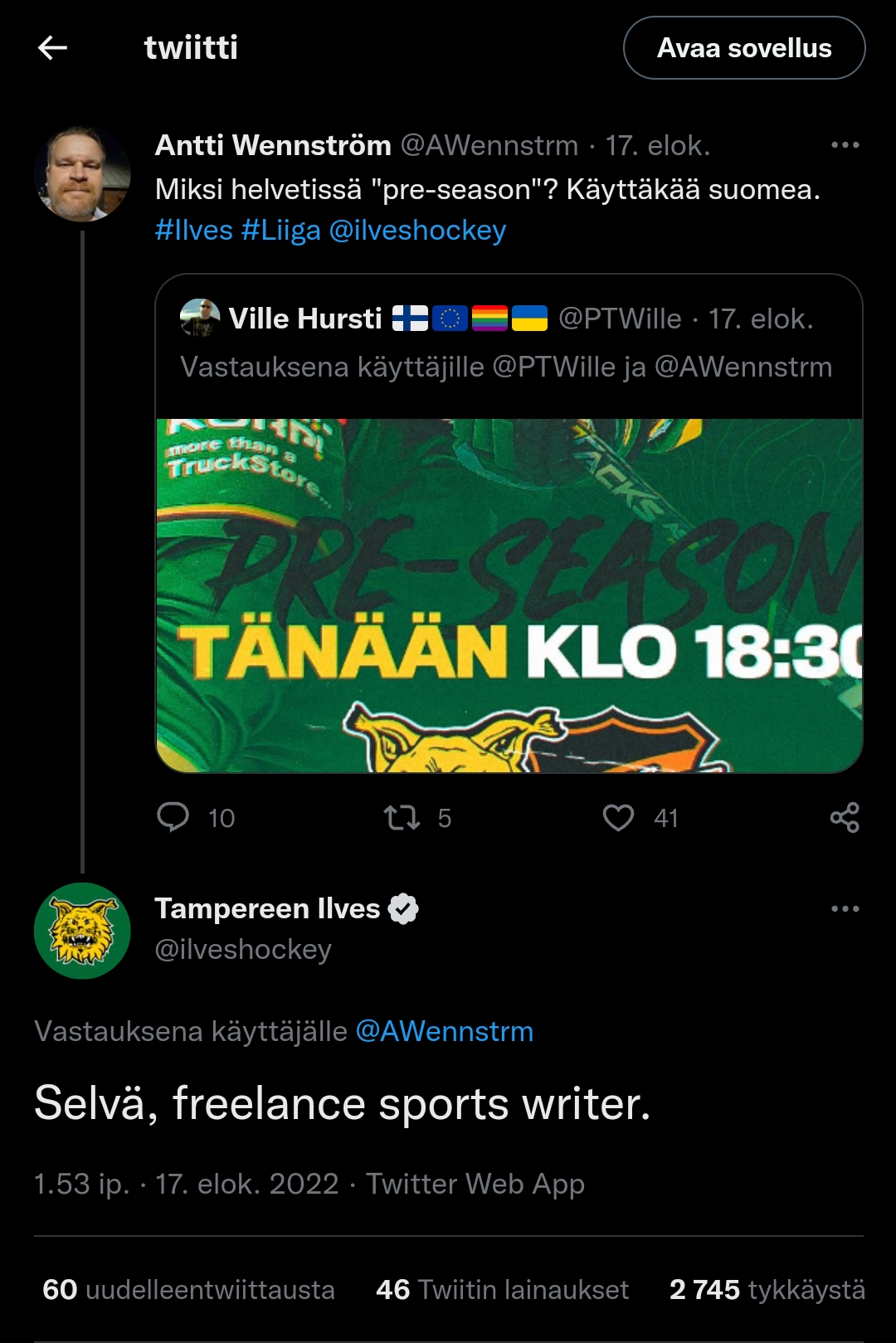 Täytyy nyt muistaa, että mitä tulee twitteriin niin ei kyllä Ilves ja Tappara paini edes samassa sarjassa. Huoli pois.