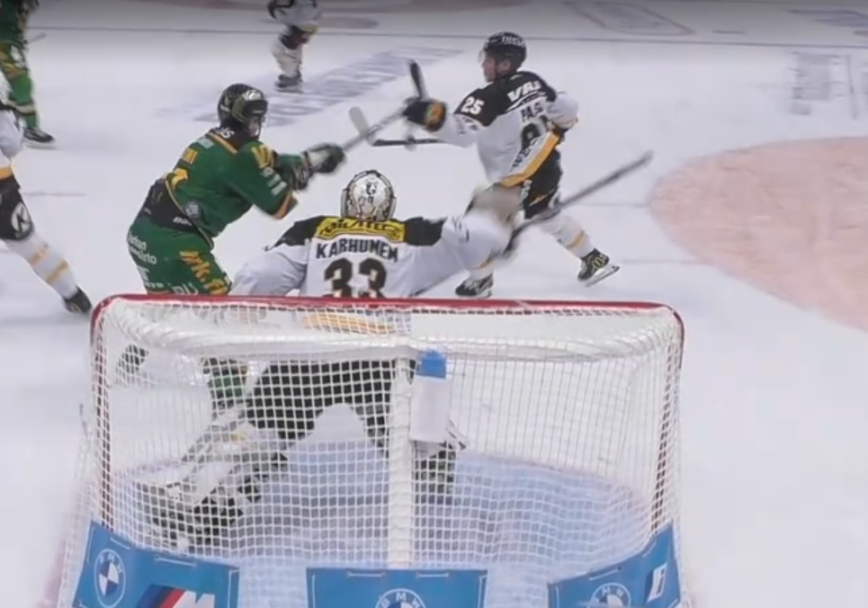 Jos en ihan väärin nähnyt niin osui Kärppä pelaajan hanskaan ja siitä meni maaliin. Ainakin Kärppä pelaajan hanska heilahti ja pyöritteli päätään heti maalin jälkeen.