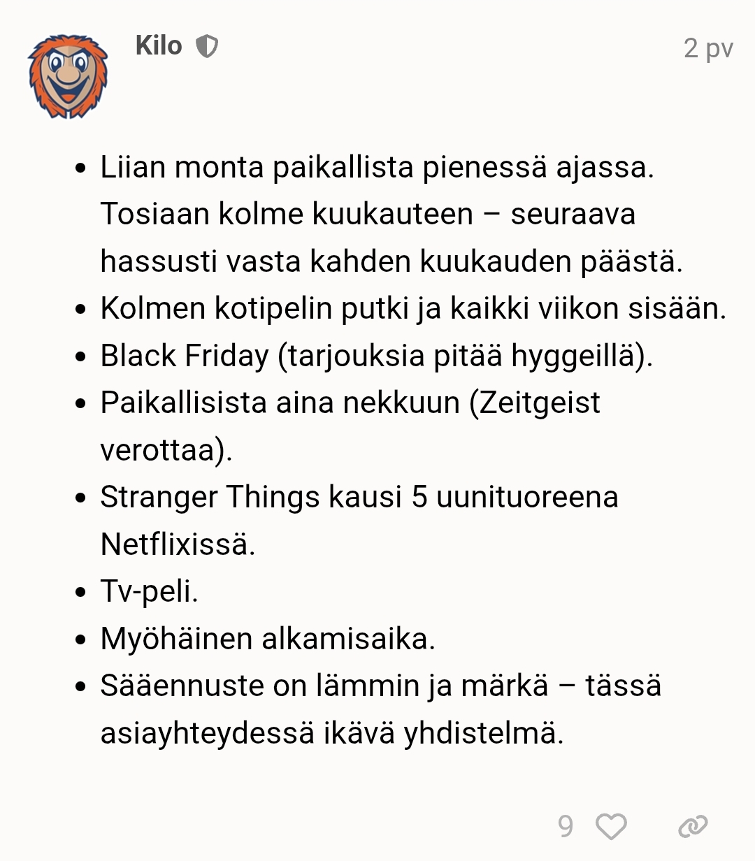 Pyh. Ettekö te ilkeät ilvesläiset nyt ymmärrä, että paremmilla ihmisillä on parempaakin tekemistä? Miten tässä nyt kukaan mihinkään paikallismatsiin kerkeää, kun pitää jännittää Stranger Thingsin viidennettä kautta samalla kun hakkaa Tokmannin nettisivuilla F5:sta, ettei mikään huipputarjous mene ohi. Puhumattakaan sääennusteesta, eihän siellä sisällä hallissa ole kivaa olla kun ulkona on niin ikävän kostea keli.