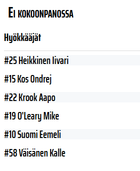 Niin suhteessa mihin se vemppa_osasto on kasvanut? Pelaajia tippuu ja tulee muillakin pudotus_pelien aikaan ja toistaiseksi ei ole edes varmuutta onko Nättinen ulkona kokoon_panosta.No jos nyt viimeistä kokoonpanoa uskoo niin Nättinen ja O'Leary tippunut ensimmäisen pelin jälkeen...ja edellisvuosina ollut kärki ukkoja sivussa pudotus peleissä.