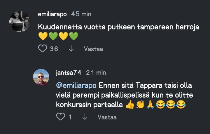 Perus tappara fanit. Muistelee menneitä eikä osaa käsittää millanen kurssi tällä hetkellä on Ilveksellä ja miten Tappara kyntää. Katkottiin muuten huima 2 pelin voittoputki, mikä oli vuoden pisin mouhojen osalta.katso liitettä 12961Ei vaan mene ymmärrykseen mitä tämä 74- vuosimallia yrittää sanoa...