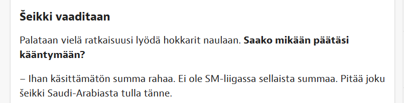 Kannattaa suunnata katse aitioon jos siellä joku Koistinen tai Salmela hilluu sheikkiasussa.Kauanko menee että joku on pelissä sheikkiasussa?