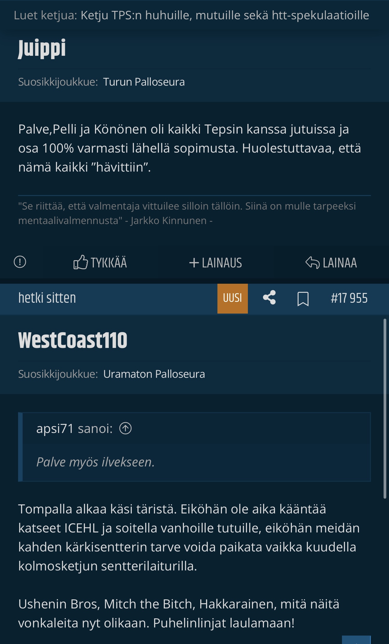 Jep. Kerrankin Ilves voisi näyttää oikeaa hauista. Sen hetki on nyt.Ruohomaa/Kunyk, laituri sekä yksi jykevä pakki meille vielä, niin on ihan sama mitä muut tankkaavat.