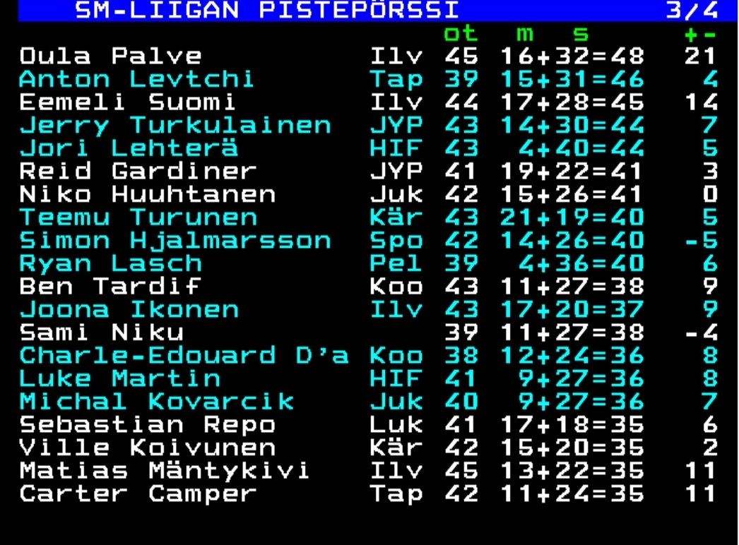 Minulle on lähetetty paljon fakseja siitä, että nämä viestini positiivisuusketjussa ovat väärin iloittuja, kun kuulemma perinteistä sarjataulukkoa parempi mittari on joku pisteet/ottelu-taulukko. Teksti-tv:ltä ei sitä löydy, joten tiukan selvitystyön jälkeen selvisi, että kyseistä tilastoa voi käydä tutkimassa SM-liigan kotisivuilta. Menin sinne ja katsoin kyseistä taulukkoa ja näyttää siltä, että Ilves on siinä taulukossa puolestaan... ykkösenä myös!