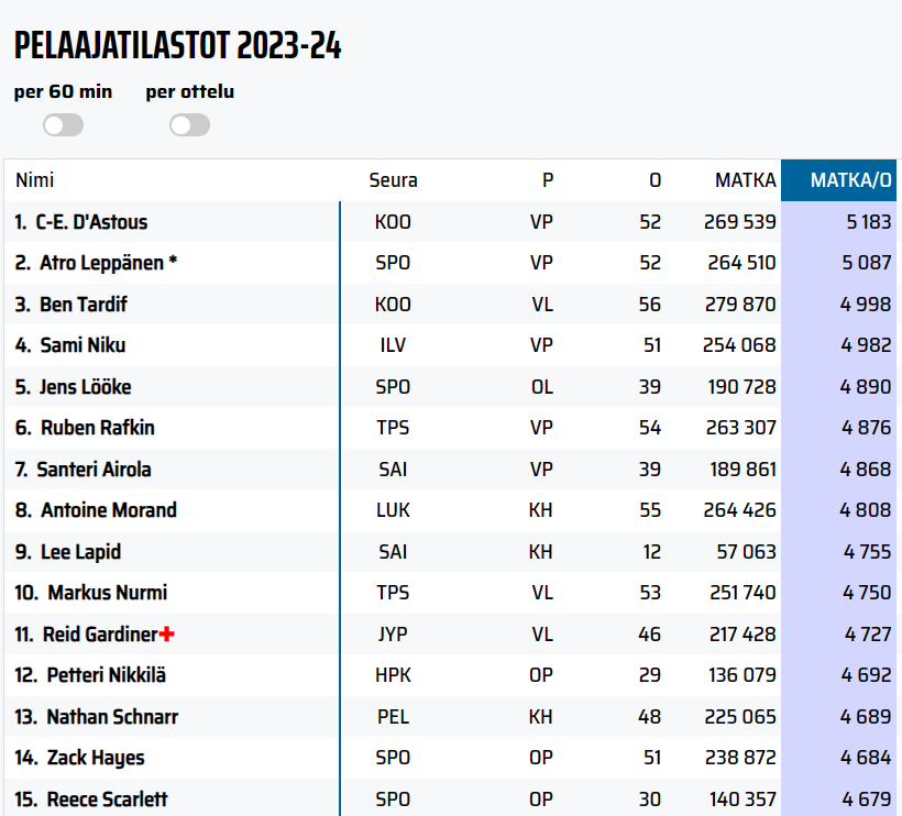 Okei, olisin voinut Liigan tilastoihin perehtyä vähän tarkemmin. Muistan vaan, että Jatkoajassa keskusteltiin siitä, että D'Astousilla ei tulisi riittämään NHL:ssä jos alkaa menemään hapoille 24min jää-ajalla. Siellä sitten otettiin Rasmus Dahlinin luistelumatka esille ja siinä selvisi että Dahlin luistelee kilometrin enemmän per peli mitä D'Astous. Se sai sen jotenkin vaikuttamaan siltä ettei D'Astous luistelisi kovin paljoa, vaikka onkin kaukana todellisuudesta tämä väite. Pahoittelut sinisilmäisyydestä.D'Astous luistelee ottelua kohden paitsi ylivoimaisesti eniten KooKoo:n pakeista niin myös selvällä erolla eniten koko Liigan kaikista pelaajista