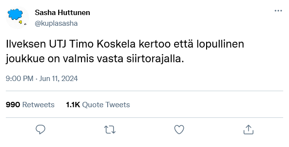 Tässä vielä lyhyt referaatti tiedotteesta jos kaikki ei ole nähnyt:Maanantaiaamuna Ilves lähetti tiedotteen, jossa seura kertoo tekevänsä kululeikkauksia ja tekevänsä muutoksia tehtävänkuviin. Urheilujohtajan tehtävä lakkautetaan kokonaan ja hoidetaan tiedotteen mukaan jatkossa nykyisen henkilökunnan voimin.