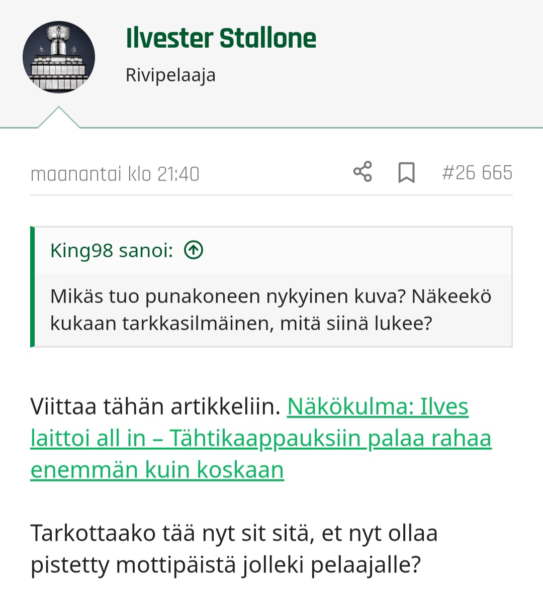 Sama kävi mielessä. Ei se tollaista muuten olis sanonut, kun ei mitään syytä. Juuri hommattu pelaaja jne.