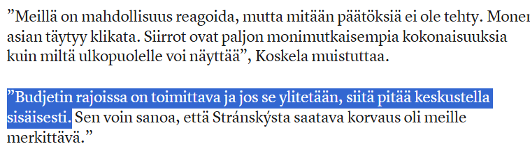 Ja oikein hardcore-salaliittoteoreetikot lukee rivien välistä myös tuon lisäyksen siitä, että budjetin ylittävät pitää sopia sisäisesti, että Tillulla on kunnon viritys meneillään![]()