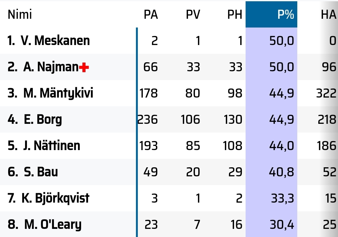 Nämä ei ole voittavan (playoff) joukkueen lukemia.