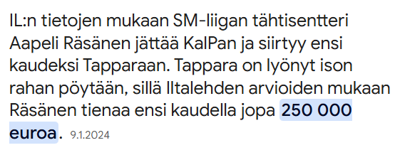 Tappara neuvotteli Räsäsen kanssa käytännössä kauden 22-23 jälkeen. Hintalappu tuolloin aivan varmasti tasolla/lähellä 200k. Omaan korvaan tuo Iltalehden 250k ampuu yli. Ajatus taas jostain 125k:sta on ihan naurettava hyvän pistepotentiaalin omaavasta rightin kahden suunnan sentteristä, kenen käyrä oli tuolloin vahvasti ylöspäin.