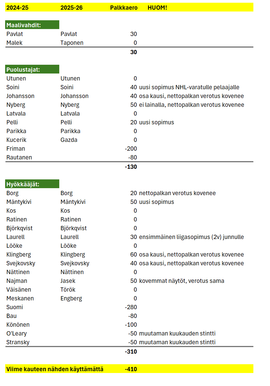 Tein täysin hypoteettisen vertailun viime kauden rosterin palkkakuluista vs. ensi kauden.