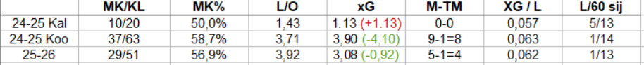 - 30 KooKoo-otteluun tullut komea viiden maalin "ylisuoritus" puolikkaaseen kauteen. Tälläkin kaudella nykyisellä tahdilla tulisi sellainen neljän maalin ylisuoritus 60 peliin. Laukausten xG-arvo ei kovin korkea ole, koska kyky tehdä maaleja laadukkaalla laukauksellakin on niin hyvää luokkaa. Meillä ei tällaisia hyökkääjiä ihan hirveästi ole. Laukoi myös KalPassa suht aktiivisesti, vaikka muutoin siellä asiat menivät aika persiilleen